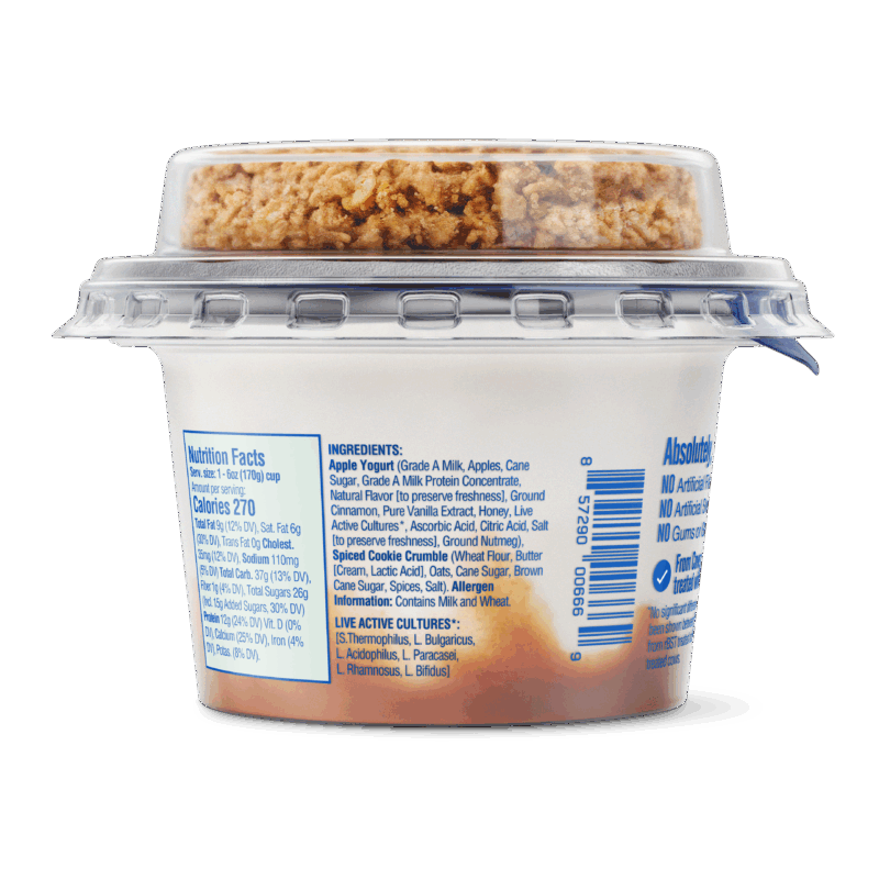 Ingredients: Apple Yogurt (Grade A Milk, Apples, Cane Sugar, Grade A Milk Protein Concentrate, Natural Flavor [to preserve freshness], Ground Cinnamon, Pure Vanilla Extract, Honey, Live Active Cultures*, Ascorbic Acid, Citric Acid, Salt [to preserve freshness], Ground Nutmeg), Spiced Cookie Crumble (Wheat Flour, Butter [Cream, Lactic Acid], Oats, Cane Sugar, Brown Cane Sugar, Spices, Salt).