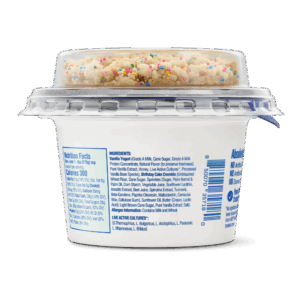 Ingredients: Vanilla Yogurt (Grade A Milk, Cane Sugar, Grade A Milk Protein Concentrate, Natural Flavor [to preserve freshness], Pure Vanilla Extract, Honey, Live Active Cultures*, Processed Vanilla Bean Specks), Birthday Cake Crumble (Cane Sugar, Unbleached Wheat Flour, Sprinkles [Sugar, Palm Kernel & Palm Oil, Corn Starch, Vegetable Juice, Sunflower Lecithin, Annatto Extract, Beet Juice, Spirulina Extract, Turmeric, Beta-Carotene, Paprika Oleoresin, Maltodextrin, Carnauba Wax, Cellulose Gum], Sunflower Oil, Butter [Cream, Lactic Acid], Light Brown Cane Sugar, Pure Vanilla Extract, Salt).
