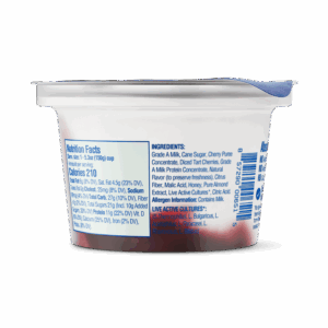 Ingredients: Grade A Milk, Cane Sugar, Cherry Puree Concentrate, Diced Tart Cherries, Grade A Milk Protein Concentrate, Natural Flavor (to preserve freshness), Citrus Fiber, Malic Acid, Honey, Pure Almond Extract, Live Active Cultures*, Citric Acid