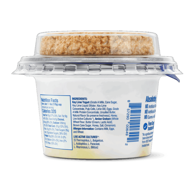 Ingredients: Key Lime Yogurt (Grade A Milk, Cane Sugar, Key Lime Liquid [Water, Key Lime Concentrate, Pulp Cells, Lime Oil], Eggs, Grade A Milk Protein Concentrate, Unsalted Butter, Natural Flavor [to preserve freshness], Honey, Live Active Cultures*), Amber Graham (Whole Wheat Flour, Butter [Cream, Lactic Acid], Brown Cane Sugar, Honey, Salt, Cinnamon).