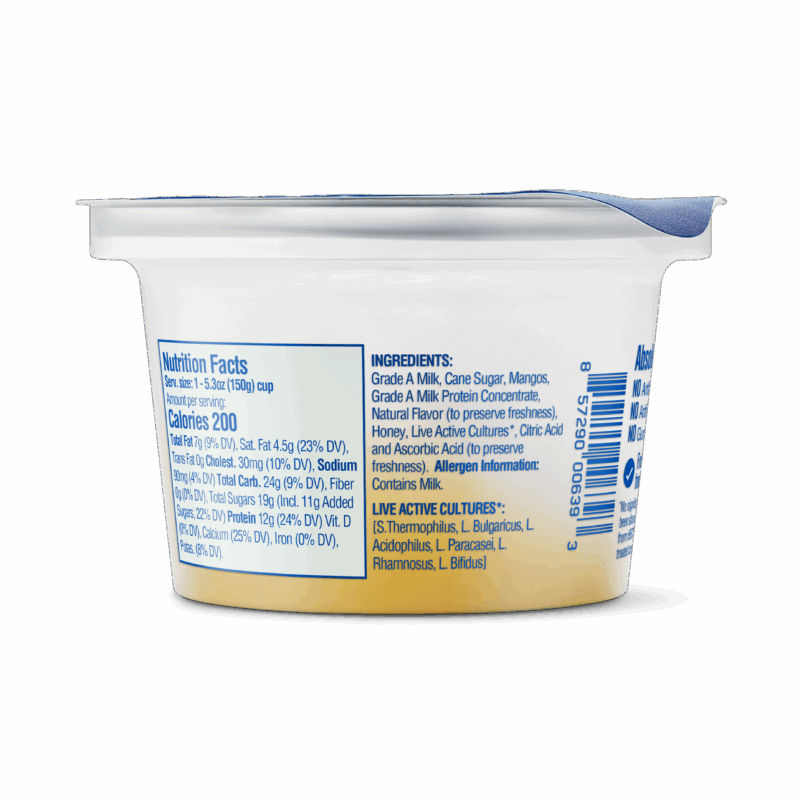 Ingredients: Grade A Milk, Cane Sugar, Mangos, Grade A Milk Protein Concentrate, Natural Flavor (to preserve freshness), Honey, Live Active Cultures*, Citric Acid and Ascorbic Acid (to preserve freshness).