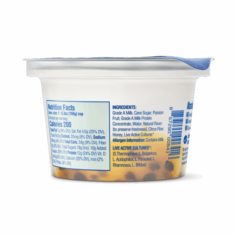 Ingredients: Grade A Milk, Cane Sugar, Passion Fruit, Grade A Milk Protein Concentrate, Water, Natural Flavor (to preserve freshness), Citrus Fiber, Honey, Live Active Cultures*.