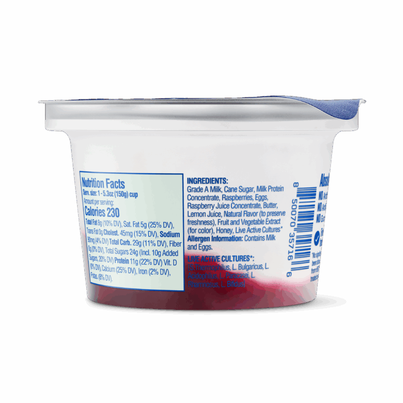 Ingredients: Grade A Milk, Cane Sugar, Milk Protein Concentrate, Raspberries, Eggs, Raspberry Juice Concentrate, Butter, Lemon Juice, Natural Flavor (to preserve freshness), Fruit and Vegetable Extract (for color), Honey, Live Active Cultures*